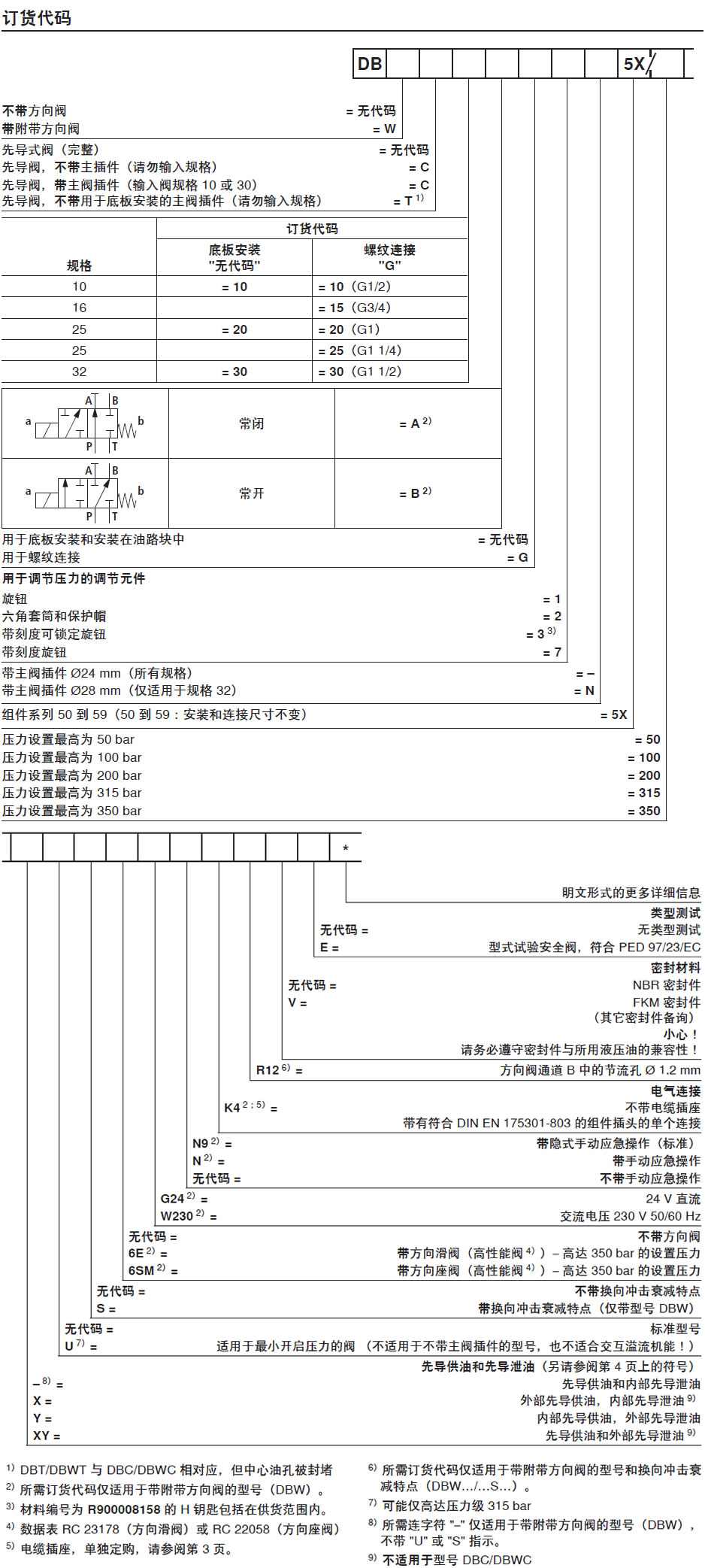 | 产品说明 DB 型压力阀是一种先导式溢流阀。用于限制工作压力。 这些溢流阀 (DB) 主要由带主阀心 (3) 的主阀 (1) 以及带压力调节元件的先导控制阀 (2) 组成。 施加在通道 P 中的压力作用于主阀芯 (3)。同时,该压力通过配有喷嘴 (4) 和 (5) 的控制油路 (6) 和 (7) 施加于主阀芯 (3) 的弹簧负载侧和先导控制阀 (2) 中的滚珠 (8)。如果通道 P 中的压力超过弹簧 (9) 上设定的值,则滚珠 (8) 将背向弹簧 (9) 打开。相应的信号通过控制油路 (10) 和 (6) 从通道 P 由内部传出。此时主阀芯 (3) 弹簧负载侧的液压油通过控制油路 (7)、喷嘴孔 (11) 和滚珠 (8) 流入弹簧腔 (12)。从此处,液压油通过控制油路 (13) 从内部流入油箱(对于型号 DB …),或通过控制油路 (14) 从外部流入油箱(对于型号 DB …Y)。喷嘴 (4) 和 (5) 会导致主阀芯 (3) 出现压降,从而使通道 P 到通道 T 的连接打开。现在,液压油从通道 P 流到通道 T,同时维持设定的工作压力。 溢流阀可通过油口“X”(15) 卸载或切换为另一压力(第二个压力等级)。 ![]() |